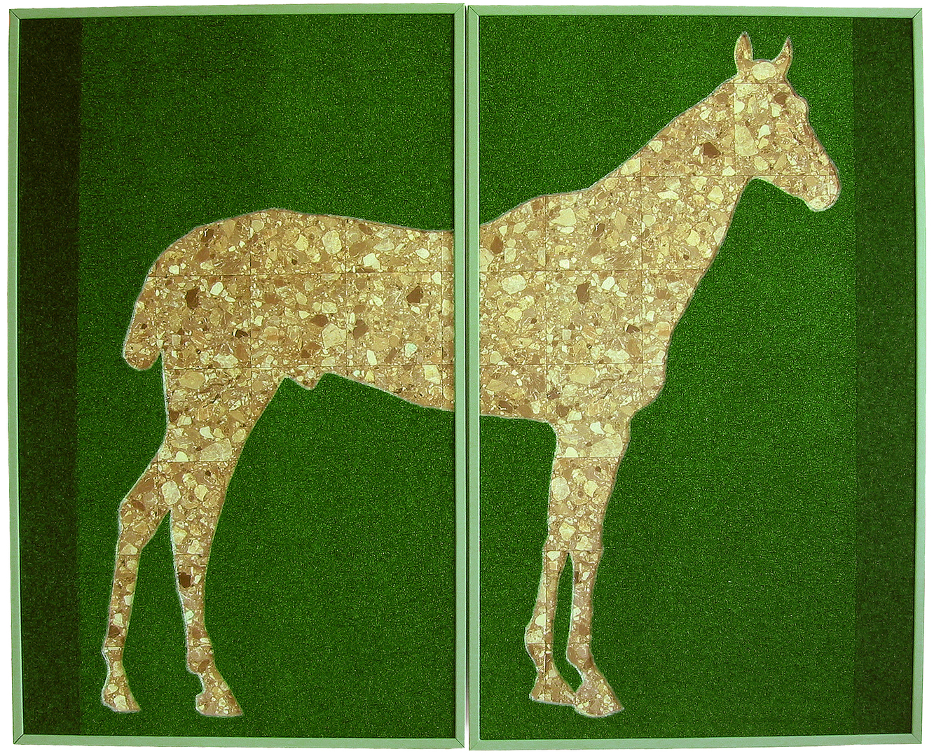 Die “Pferde” beschreiben einen Zyklus, in dem die klassische Malerei der Darstellung heroischer Abbildungen von Menschen auf Pferden oder nur posierenden, und ungebändigten Pferden, im krassen Gegensatz dargestellt wird. Eine Mixtur aus banalen und einfachen synthetischen Materialien bildet den Rahmen für die Komposition und Lebhaftigkeit des Pferdes. Dass fast alle Pferde nicht komplett sind, zusätzlich zu der synthetischen Abstraktion in der Darstellung des Tieres, ist klar. Das dem Menschen in der Historie und Kultur am naheliegendste und zweifelsfrei immer willige und nützliche Lebewesen ist fragmentiert, und in seiner Vollständigkeit doch unvollständig.