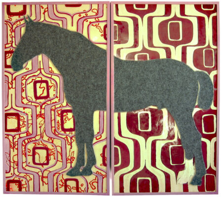 Die “Pferde” beschreiben einen Zyklus, in dem die klassische Malerei der Darstellung heroischer Abbildungen von Menschen auf Pferden oder nur posierenden, und ungebändigten Pferden, im krassen Gegensatz dargestellt wird. Eine Mixtur aus banalen und einfachen synthetischen Materialien bildet den Rahmen für die Komposition und Lebhaftigkeit des Pferdes. Dass fast alle Pferde nicht komplett sind, zusätzlich zu der synthetischen Abstraktion in der Darstellung des Tieres, ist klar. Das dem Menschen in der Historie und Kultur am naheliegendste und zweifelsfrei immer willige und nützliche Lebewesen ist fragmentiert, und in seiner Vollständigkeit doch unvollständig. Es fehlt das Lebenswichtige und Essenzielle, um die Balance und das Überleben zu gewährleisten.