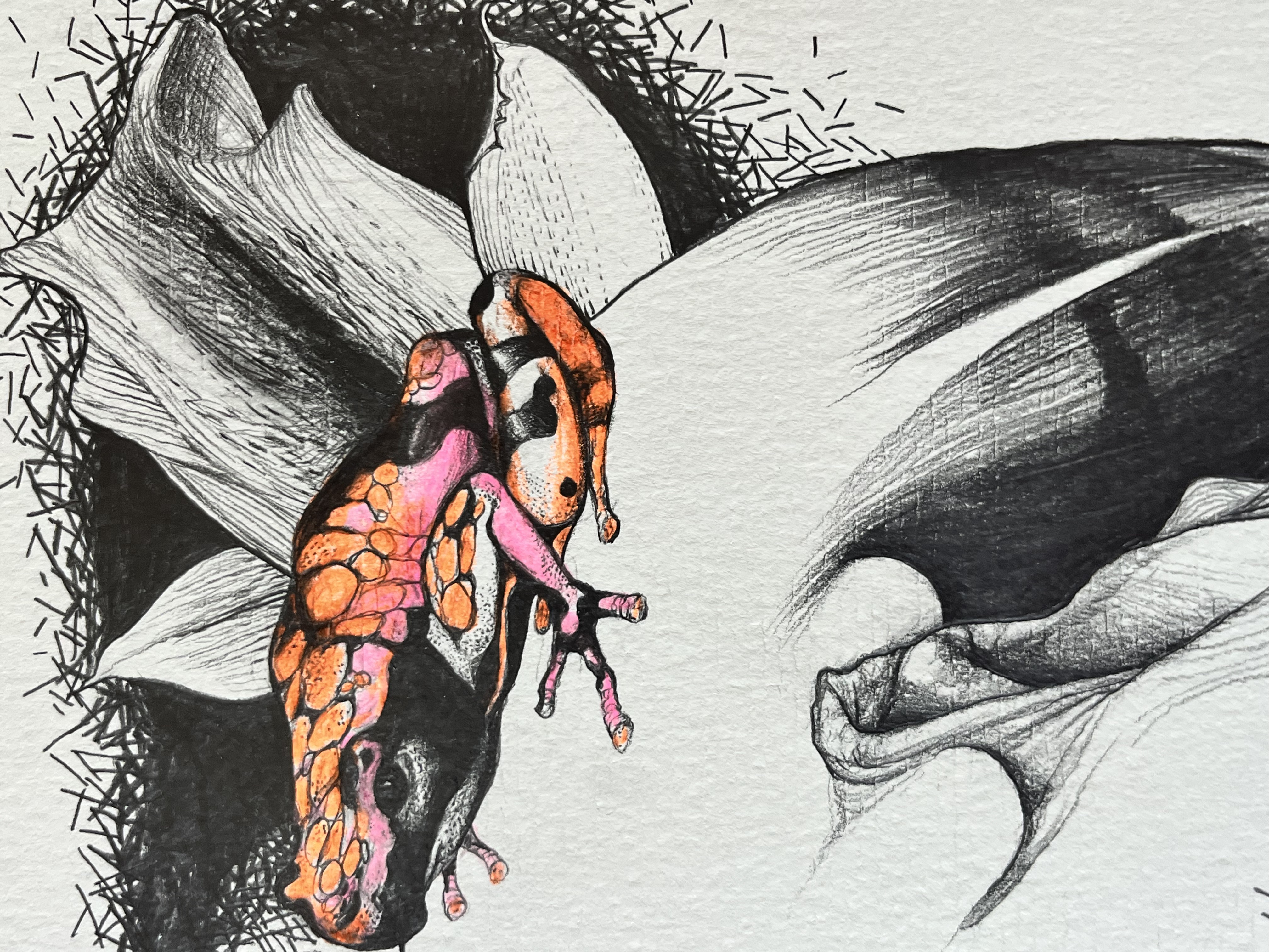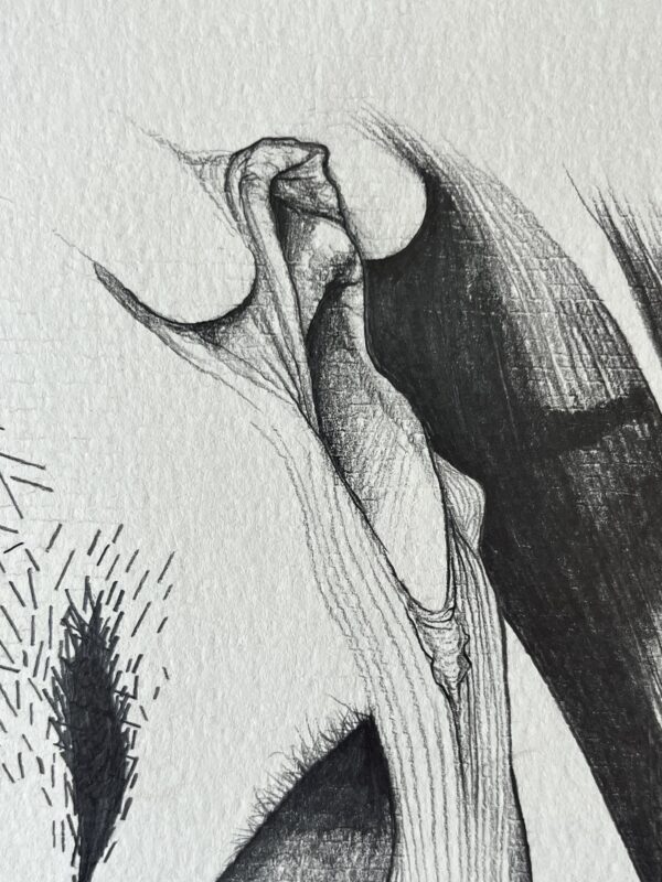 Ein Gegensatz aus Erdverbundenheit und Heimat: Mensch, Körper, Natur, Eichel, vielleicht Teile eines weiteren Tieres, einer Pflanze … Verstrickung.