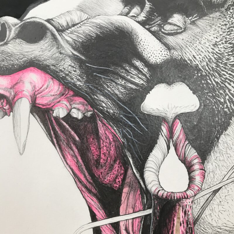 In dieser Arbeit treffen die Elemente Mensch, Tier und Pflanze aufeinander.