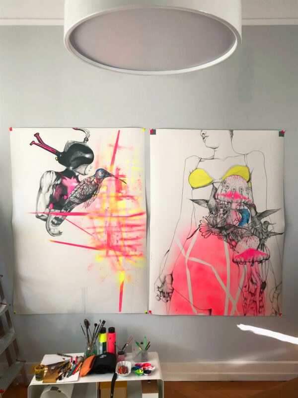 Der Effekt des Neon ist allgegenwärtig und bildet besonders bei den Zeichnungen einen starken Kontrast zu dem Grafit. Mal als Betonung, mal als aufgeladenes, kraftvolles Rauschen im Hintergrund.